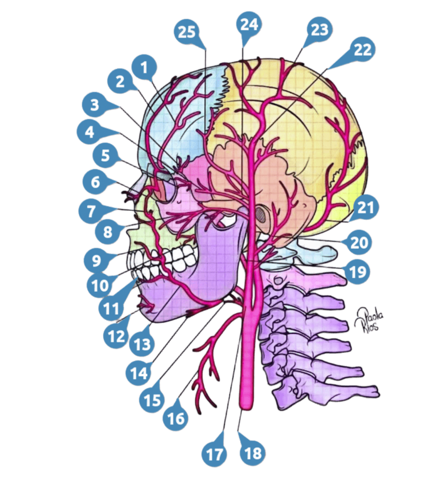 El diagrama ilustra la Arteria Carótida Externa y sus ramas principales, distribuidas en regiones anatómicas específicas del cuello y cabeza. Las arterias están representadas en color rosa, mientras que el cráneo y estructuras óseas se muestran en tonos pastel para diferenciar territorios.